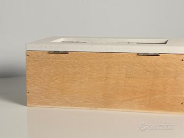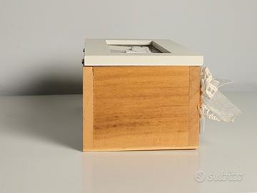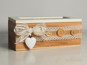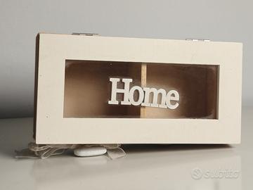 Elegante scatola in legno stile shabby chic, con coperchio in vetro e scritta Home in rilievo. Decorata con pizzo, bottoni in legno e un cuore bianco, è perfetta come portagioie, porta bustine da tè, portachiavi o come cofanetto decorativo per la casa.