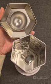 Scatola in metallo Carillon Concerto Marie Ange Di Costa, di forma esagonate su base rotonda. La base girevole funge da carica per il carillon presente all'interno, che fa girare la parte superiore, decorata con immagini a bassorilievo, accompagnata da una melodia. Altezza 19 cm, ottime condizioni salvo qualche lieve segno sulla base visibile in foto.