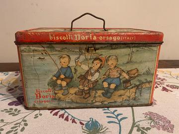Modernariato scatola in metallo Doria Biscotti Orsago anni '50 (dimensioni 20 x 13 x 11 cm.) ha su tutti i lati e sul coperchio immagini retrò con dettagli particolareggiati e colori pastello, presenta segni del tempo: ossidazione, piccole ammaccatture, manca gancio chiusura e qualche macchia (come da fotografie) che gli conferiscono carattere e ne esaltano maggiormente il fascino vintage.