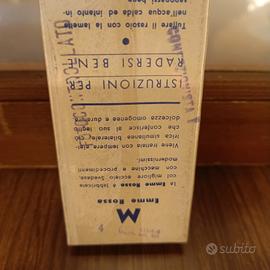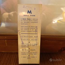 Scatola in cartoncino ancora imballata con cellophane contenente 100 lamette 0,13. Marca Emme Rossa Timbro sul retro gennaio 1944 14x5x2 cm