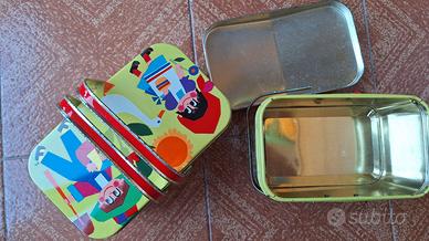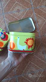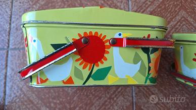 Scatola in latta a cestello Milano Alemagna, product of Italy. Pezzo vintage da collezione, disponibile in doppio esemplare. Conteneva caramelle. Colore verde chiaro, con disegni di oche e bambini contadini. Misure: altezza 8 cm, 16x9 cm. Coperchio leggermente bombato e doppio manico metallico. Disponibili molte altre scatole in latta da collezione. Prezzo unitario