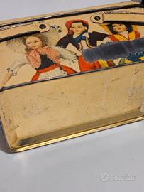 Scatola vintage in latta, ideale per conservare biscotti o come pezzo da collezione. Scatola della seconda metà del Novecento a forma di bauletto larghezza 12,5 cm lunghezza 20 cm altezza 10 cm