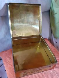 Scatola quadrata in latta colorata di biscotti Colussi degli anni Sessanta, con pittoresche immagini di Venezia. Misure: 22 x 22 altezza cm. 7
