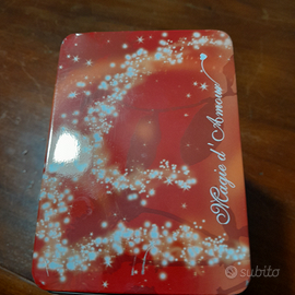 Scatola in latta con carillon "Di Costa", usato, scatola per pasticceria. Altezza 18 cm, dimensioni base13×9 cm. In ottime condizioni, carillon funzionante, sfondo rosso, ogni lato ha una figura diversa