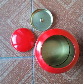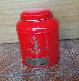 Scatola in latta da collezione. Oggetto in ottimo stato, adatto alla conservazione del tè. Doppio pratico coperchio, come da foto. Scritta/marca: La via del tè - Firenze. Colore: rosso. Ideale per il periodo natalizio. Misure: altezza 11 cm, diametro 9 cm. Disponibili altre scatole in latta