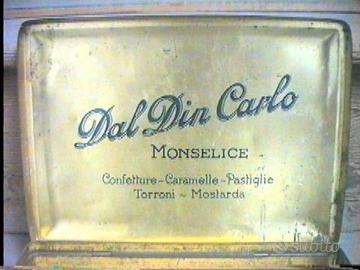Esemplare scatola d'epoca di latta litografata della rinomata ditta Dal Din Carlo - Monselice - Confetture - Caramelle - Pastiglie - Torroni - Mostarda. Sulla foto nel bordo frontale si legge chiaramente la pur rinomata manifattura: S.A. De Andreis - Casanova - Genova - Sampierdarena 28. Caratteristica particolare rappresentazione con elegante immagine d'arte classica e decorazione lungo tutto il bordo laterale superiore e inferiore. Complessivamente ancora in buone condizioni, non ho mai trovato altro pari esemplare. Eventualmente valuto la spedizione.
