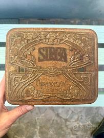 Antica scatola pubblicitaria in latta Chiambretto & C. – Torino, databile intorno al 1910, utilizzata nelle confetterie italiane per la vendita di confetti e caramelle alla frutta.