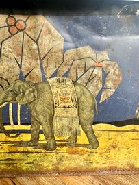 Grafica liberty coloniale con elefante e dicitura “Vero Estratto Caffè Olandese”.