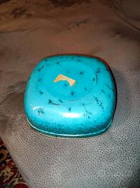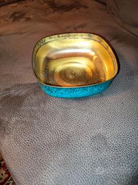 Bella scatola di latta colore verde marmorizzato con disegni e finiture dorate anni 60/70 Quadrata misure 15*15 h 5.5
