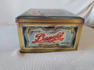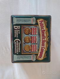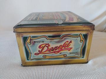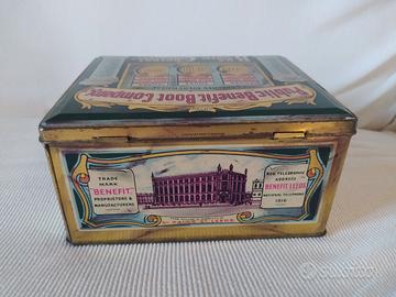 splendida scatola di latta pubblicitaria vintage della "Public Benefit Boot Company", un'azienda britannica che un tempo era molto nota per la produzione e la vendita di calzature. Fondata alla fine del XIX secolo (intorno al 1875) da William Henry Franklin, l'azienda aveva la sua sede principale e i magazzini a Leeds, in St. Paul’s Street (come indicato chiaramente sul lato della scatola). Il nome "Public Benefit" (Beneficio Pubblico) serviva a sottolineare l'idea di offrire scarpe di buona qualità a prezzi accessibili per la classe operaia. Il design è tipico dello stile dell'inizio del XX secolo. Si vedono i riferimenti alle "Tre Medaglie d'Oro" vinte, un vanto comune per le aziende dell'epoca per dimostrare l'eccellenza del prodotto. Lo slogan: "Comfort, Consistency, Cheapness" (Comfort, Consistenza, Convenienza) riassume perfettamente la loro filosofia commerciale. L'illustrazione sui lati mostra i maestosi uffici di Leeds, che fungevano anche da centro di distribuzione per i loro numerosi rami (elencati nelle colonne ai lati del coperchio). Il marchio "Container Made in England" sul fondo conferma la sua origine britannica. 17x14 cm.