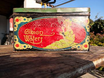 Stupenda scatola in latta Wafers Albion ditta Ferrarini di Casale Monferrato, risalente agli anni 10, Dimensioni 220x220x120 mm