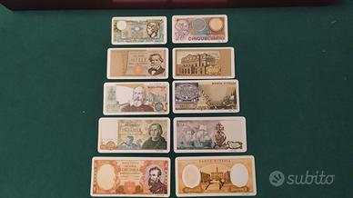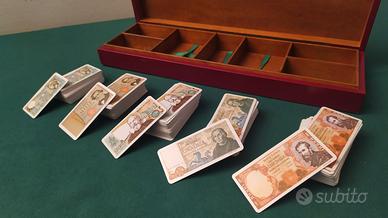 SPLENDIDA E RARA CASSETTA D'EPOCA IN LEGNO FODERATA IN PELLE CON 148 FICHES CHE RAFFIGURANO LE BANCONOTE DELLE NOSTRE VECCHIE, GLORIOSE E AMATE LIRE.