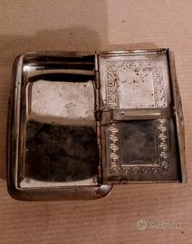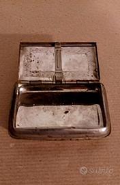 Antica scatola in metallo, dimensioni 9x6x2,5cm. Presenta segni del tempo e un aspetto vissuto.