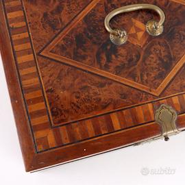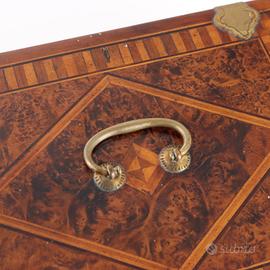 Scatola necessaire in legno impiallacciato in radica con filettatura in acero e mogano. Serratura, cerniere e maniglia in ottone. Specchio da tavolo sotto il coperchio. Chiave coeva. Codice: OGANOG0268655 Condizione prodotto: Oggetto in buone condizioni, presenta segni di usura e mancanze all'interno. Cerchiamo di presentare lo stato reale dell'oggetto nel modo pi completo possibile con le foto. Qualora alcuni particolari non risultassero chiari dalle foto, fa fede quanto riportato nella descrizione. Misure: Largh.:28.00 cm, Alt.:10.00 cm, Prof.:21.00 cm QUESTO ARTICOLO E' DISPONIBILE PRESSO IL NEGOZIO DI CAMBIAGO Venditore: Barbara (dal Luned al Venerd : dalle 9:00 alle 19:00, Sabato: dalle 10:00 alle 19:00) Per maggiori informazioni contattateci su Whatsapp. Disponibile ad inviare video o foto integrative su Whatsapp Di Mano in Mano, Negozio dell'usato di Cambiago, via Castellazzo 8. Oltre 4000mq espositivi, tra usato, vintage, modernariato, antiquariato, arte e libri. Esplora il nostro portale mercatiniusato.org per scoprire centinaia di arredi usati.