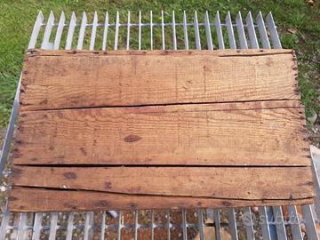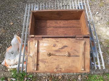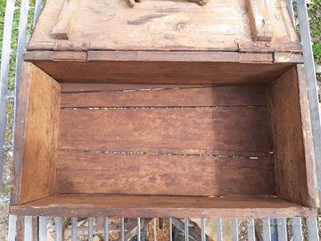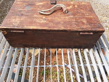 probabilmente una vecchia valigia poi divenuta cassetta degli attrezzi, in legno. misure 42 cm x 23 cm h 14 cm. in buono stato di conservazione, con manico di corda e cerniere metalliche