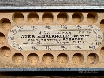L’oggetto è un pezzo di storia dell'orologeria meccanica: una scatola d'epoca (probabilmente della prima metà del '900) per contenere gli assi del bilanciere (in francese: Axes de Balancier). L'etichetta specifica che sono per orologi di tipo “Roskopf “famosi per essere "l'orologio del popolo": robusti, economici e con un meccanismo semplificato.