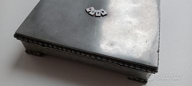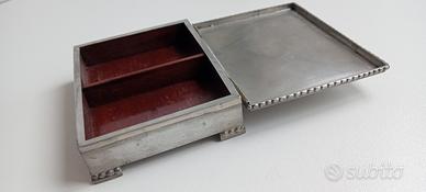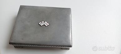 Scatola per doppio mazzo di carte da gioco, peltro, con punzone E8 Tenn e nr. seriale 8/1285. Interno in legno. 12x15cm, h2cm.