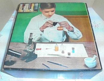 scatola piccolo chimico vintage con microscopio