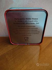 Contenitore porta panino Mulino Bianco. Coperchio non staccabile con panino in rilievo, nuovo mai utilizzato, qualche piccolo graffio su un bordo (vedi foto) Misure: cm. 12,5 x 12,5 x 5. Prodotto in Italia. Spedizione rapida