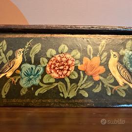 Su questo piccolo coperchio, i cavalieri lanciano i loro cavalli in una corsa elegante, mentre impugnano lunghe mazze di legno sottile: non sono racchette, e nemmeno mazze da golf… sono gli strumenti del Chovgan, l’antico gioco persiano che ha dato origine al polo moderno. E più la guardi, più ti accorgi dei dettagli: il passo leggero dei cavalli, le vesti decorate, i cappelli dalla forma insolita. È come se la scena stesse per muoversi. Ai lati, piccoli uccellini e fiori dai colori accesi aggiungono un equilibrio perfetto, come un respiro visivo che accompagna la vivacità della scena centrale. Quando la apro, la lacca scura e lucida crea un contrasto elegante, un invito silenzioso a custodire qualcosa che merita attenzione. È una scatola semplice, eppure piena di una delicatezza rara: un frammento di arte indo-kashmira degli anni ‘50-‘60 che porta con sé un pezzetto di cultura, di gioco, di movimento. E mentre la guardi, forse puoi già immaginare cosa potresti affidarle: una penna speciale, un biglietto prezioso, un ricordo che desideri proteggere.