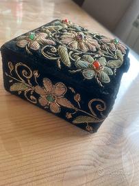 Scatola portagioie vintage in velluto nero ,ricamato a mano con perline ,misure 12x12x6 presenta piccoli segni di usura ,come da foto