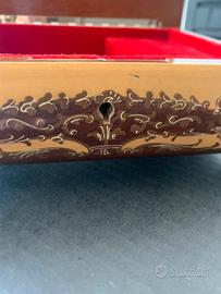 In legno intarsiato a mano, interno in velluto rosso, con scomparto e specchio. Carillon funzionante, melodia Love story, piedini originali, due chiavi.
