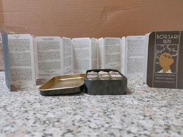 Profumi Borsari, dal 1870, 6 Fragranze. Le boccette sono integre. La confezione in latta mostra segni del tempo, come da foto, come opacizzazioni in alcune aree e modesti segni di sfregamento. Presente la brochure, perfetta. Profumi mignon da 20 ml ciascuno. Da collezione.