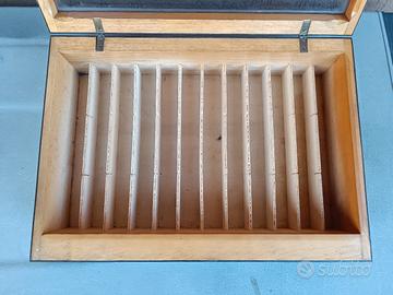 Scatola in legno utilizzata nelle farmacie degli anni 60/70 per la vendita delle note siringhe Pic Indolor. Qualche inevitabile segno del tempo ma nel complesso In buone condizioni. Misure 33 x 9 x 23 cm