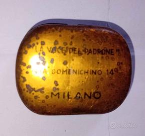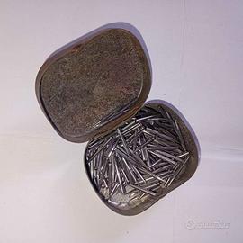 Scatolina latta piena di puntine, ovviamente nuove. Originale La voce del padrone, via Domenichino 14, Milano. Misure 4x3x1 cm.