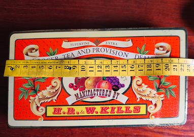scatola di latta vintage risalente probabilmente agli anni 30/40. Contenitore di tè o biscotti prodotto da H.R. e W Kills. Design decorativo con illustrazioni di frutta. Per collezionisti e amatori. Astenersi perditempo.