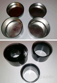 Coppia di vecchie scatole Inglesi per pellicola "ILFORD FP4 e HP4" (35 mm, 17 m). Scatole di latta usate con inevitabili segni del tempo. Comprendono vari metri di negativi fotografici vintage. Euro 15.