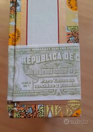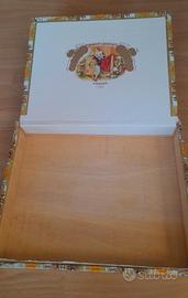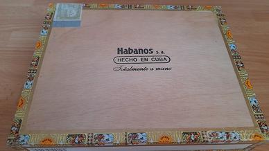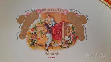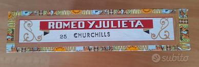 Scatola vuota originale in legno di sigari Romeo y Julieta, una delle marche più iconiche di Habana, Cuba. Si tratta della prestigiosa edizione Churchills nota per la sua storia legata al celebre statista britannico. La scatola conserva il Sigillo di autenticità (Sello de garantia nacional) repubblica di Cuba per tabacco torcido (fatto a mano), con ologramma originale e il riferimento alla legge del 1912 che certificano la provenienza ufficiale Havana. Modello 25 Churchills, in legno con rivestimento cartaceo decorato, sul coperchio sono visibili le medaglie d'oro vinte dal brand in diverse esposizioni mondiali. Buono stato vintage ha solo qualche graffietto sul coperchio,le stampe sono nitide e i colori vivaci, presenta i sigilli originali "Habanos" e i timbri sul fondo "Hecho en Cuba - Totalmente a mano". Dimensioni 19,3x24,5x4,5 cm