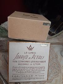 Rara e deliziosa confezione, VUOTA, della rinomata cipria "Sorriso di Petali", una creazione superba della Fioritecnica di Milano, le cui fabbriche sorgevano nella pittoresca Castelgoffredo, Mantova. Un tocco di charme risalente ai ruggenti anni Venti, quest'oggetto prezioso è una vera e propria reliquia di bellezza. Una nota intima, vergata sul fondo della scatola, svela il suo prestigio: "Viene costantemente usata dalla nobiltà nazionale ed estera" In eccellenti condizioni, ha un piccolo segno del tempo sulla sovrascatola, un taglietto vicino alla piega dell'aletta di chiusura, e un segno scuro sul fondo, vedi foto. Assolutamente inodore, se non il suo lieve e piacevole delicato profumino originale della cipria, che un tempo conteneva, un gioiello per una toeletta d'altri tempi. DIMENSIONI La Scatola Rigida Base: 9,2 cm x 9,2 cm, con bordo dorato luminoso. Altezza: 4,7 cm. Ha una finitura color crema anticato che ricorda la pergamena, con delicate venature marroncino chiaro. I bordini spatolati in oro le conferiscono un'aria di lusso discreto. La scritta sul coperchio è impressa a secco, in un oro che brilla di luce propria. Sul fondo, una minuscola etichetta oro e nera dichiara la nuance: "Ocra rosato". La Sovrascatola Cartoncino leggero, ruvido,ha un lieve scurimento dovuto al passare del tempi. Dimensioni: 9,5 cm x 9,5 cm x 5 cm di altezza. Stampa in oro su sfondo crema, con un'etichetta laterale che rivela il colore: "Rachel 1°". Il piumino è gli oggetti di scena non sono compresi sono puramente ispirativi. Spedizione accurata e veloce SCONSIGLIO Poste italiane sono lente e inaffidabili