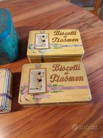 Vendo lotto di scatole di latta composto da: - tre scatole Biscotti Plasmon - una scatola caramelleLeone Vintage.