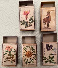 Lotto di 5 scatole di fiammiferi vintage svizzere dedicate alla flora e fauna alpina.