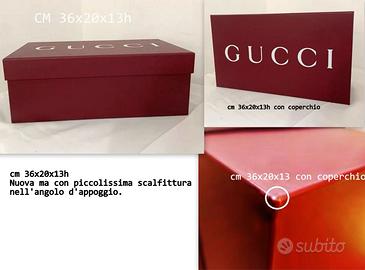 DISPONIBILI SCATOLE GUCCI VUOTE DA CONFEZIONE, in eccellenti condizioni (vedi descrizione sotto) prezzi a partire da 20€. I prezzi variano in base alla CAPIENZA (h/profondità) al modello ed alle condizioni. Misurate prima cosa dovete inserirci. Altre foto non posso inserirne ma posso inviarle nella messaggistica. Elenco in ordine di H (profondità/capienza): 1) ESAURITA - scatola (alta 5cm) 40x30x5h; nuova, €20, Foto1 2) ESAURITA - scatola (alta 12cm) 36x28x12h; nuova, €30, col. rosso ancora, chiusura a linguetta, adatta per borsa; Foto 1 + 4; - Disponibile altra uguale ma con difetti (sconto), chiedere foto se interessati. 3) scatola (alta 13cm) 36x20x13h; come nuova, €25, col. rosso ancora, chiusura a coperchio, adatta per scarpe e quant'altro di idonea misura; presenta una piccolissima scalfittura all'angolo inferiore della base di appoggio; Foto 2 4) scatola (alta 13,5cm), 37x21x13,5h; come nuova, €25, verde damascata, chiusura a coperchio, adatta per scarpe anche da uomo e quant'altro di idonea misura; Foto 1 + 5. 5) scatola (alta 15cm), 46x38x15h; come nuova, €35, col. rosso ancora, chiusura a linguetta, adatta per borsa o zaino; presenta un piccolissimo puntino chiaro sul bordo lato lungo ; Foto 3 6) ESAURITA - scatola (alta 18cm), 38x28x18h; nuova, € 40, col. rosso ancora, chiusura a linguetta, adatta per borsa; Foto 1; - Disponibile altra uguale ma con difetti (sconto), chiedere foto se interessati. 7) DUST BAG GRANDE quadrata cm 68x68, NUOVA (SACCA CUSTODIA ANTIPOLVERE per BORSA o ZAINO in stoffa bianca); €30; Foto 6. Contattatemi per ulteriori info o per la scelta e se necessita la spedizione farò un annuncio apposito per l'oggetto richiesto con l'esatto costo di spedizione. E' gradita la consegna a mano in zona San Paolo, oppure spedisco. #idearegalo #confezionegucci #scatolagucci #guccidustbag