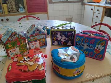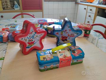 3 scatole computer anno 2003 vuote 40euro ,2 astucci Kinder anno 2002 euro 20 , scatole in latta stella e una valigetta euro 30 ,scatole casina anni 2000 con scatoline barrette dentro vuote 20 euro ,,2 scatole valigia 30 euro ,2scatole Tommy e Gerry 20 euro 4 scatoline animali e unA di Geppetto euro 30 euro sarebbero 190 ma se prese tutte 120