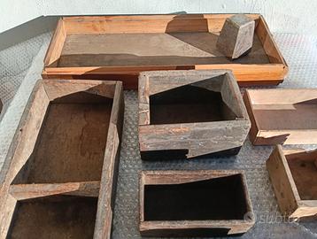 mix di 9 scatole in legno, antiche, anni 30/40 c.a numero e dimensioni come da foto. bene conservate.