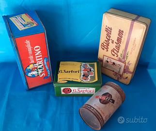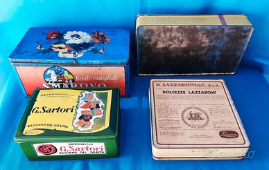 Vendo scatole in latta pubblicitarie antiche, n. 7 pezzi, 2 Doria diverse, 1 scatola Plasmon, 1 Lievito vanigliato San Marino contiene 200 bustine, 1 barattolo caffè Ruffo, 1 scatola Lazzaroni Saronno, 1 Droghificio G. Sartori Bassano del Grappa, tutte in buone condizioni come da foto. - 2 Doria, una Riviera più antica, 1 Doria Bucaneve, misure di entrambe 14,5 cm x diametro 19 cm; - 1 Plasmon altezza 7 cm, lunga 33 cm x 19 cm; - 1 Lievito San Marino altezza 14 cm x 31 x 18 cm; - 1 barattolo caffè Ruffo altezza 18 cm, diametro 11 cm, da un lato patina arruginita; - 1 Lazzaroni Saronno altezza 5 cm, lunga 22 cm, profondità 23 cm; - 1 G. Sartori droghificio bassano del grappa altezza 9 cm x 22 x 15 cm. Peso totale 2,5 kg. Spese di spedizione 12 euro.