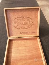Scatola in legno di sigari olandesi Willem II, tipo Eminentes. La scatola è in perfette condizioni, epoca anni' 50, dimensioni cm. 18 per 16, prezzo 15 euro. Infine una scatoletta di metallo (vuota) di pastiglie di codeina Carlo Erba degli anni '50 (10 euro) ed una di cerotti Johnson. Se acquistate in blocco si vendono a 30 euro.
