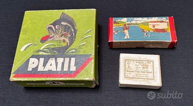 Perfette per collezionisti! Tre scatole originali vuote di attrezzatura da pesca anni '40-'60, grafica vivace e ben leggibile nonostante leggera usura d'epoca. Ideali per esposizione, no esche interne ma condizioni generali eccellenti coerenti con età, alcuni angoli presentano strappi che non inficiano sull'aspetto della grafica (vedi/chiedi foto per condizioni).