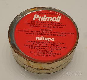 Vendo scatoletta d'epoca in metallo. Conteneva le pastiglie per la gola Pulmoll. La scatoletta è in buone condizioni, con normali segni dovuti all'età.