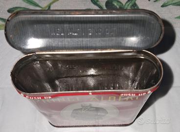 Storico contenitore per tabacco da pipa e sigarette, in metallo litografato rosso, con ritratto ovale del “Principe Alberto” (in realtà Edoardo VII) e scritte in giallo e bianco.