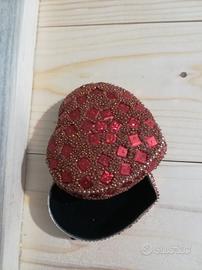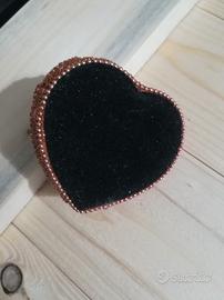 Scatolina in alluminio a forma di cuore. Ricoperta di paillettes rosse all'esterno e foderata in vellutino nero all'interno. Cm 7,5x7