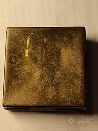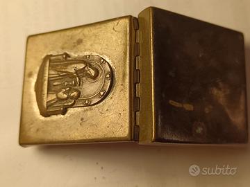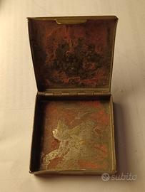 Affascinante scatola in metallo con bassorilievo a soggetto religioso in puro gusto Decò, realizzata tra gli anni 20 e 30. Buona conservazione, come da foto.