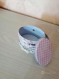 Scatolina in latta rosa con fiori con manico.