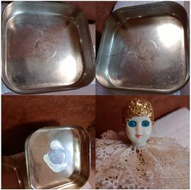 Scatolina in metallo con testa di bambola da ballo Veneziano o da bambola Pierrot che è una maschera della commedia dell'arte italiana nata in Francia verso la fine del Seicento.