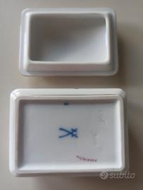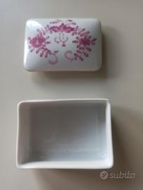 Scatolina con coperchio in porcellana Meissen con motivi floreali dipinti in rosa su fondo bianco. Bordo dorato.