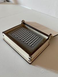 Elegante scatolina porta carte prodotta artigianalmente con taglio laser. Possibilità di eseguire dediche e incisioni personalizzate. Idea regalo.