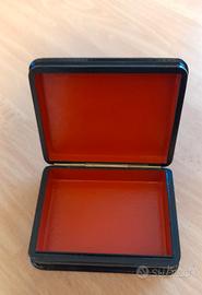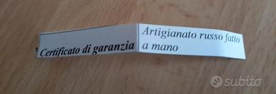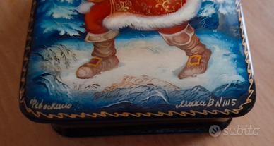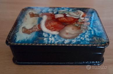 Scatolina russa originale dipinta a mano secondo la prestigiosa tradizione Fedoskino, raffigurante un Babbo Natale (Ded Moroz) finemente dettagliato. Dimensioni 10,5x8 cm, realizzata a mano in papier-mache (cartapesta), include certificato di garanzia originale ("Artigianato russo fatto a mano"), presenti sul fronte firme e diciture originali dell'artista e della scuola Fedoskino, sul fondo è presente il bollino della "Russian Collection". In ottime condizioni, la lacca è lucida e i colori vividi, interni perfetti senza macchie.